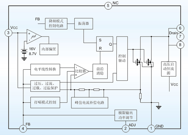 內(nèi)置峰值電流補(bǔ)償電路,可以使不同交流電壓輸入時(shí)極限峰值電流一致。還可以通過(guò)調(diào)節(jié)端電阻調(diào)節(jié)極限輸出功率。上電時(shí),峰值電流補(bǔ)償最大,然后逐漸達(dá)到平衡,可以減小在上電過(guò)程中變壓器的應(yīng)力,防止變壓器飽和。