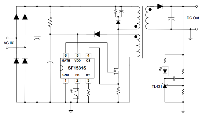 SF1531S是一種高性能,低成本,高度集成的電流模式PWM控制器離線反激式轉換器應用。PWM開關頻率與混洗是外部可編程,這可以減少一個電源傳導EMI發射。當 輸出功率要求降低,IC自動減小開關頻率高的功率轉換效率。當電流設定點降到低于給定值,例如輸出功率的需求減退, IC進入突發模式,并提供出色的效率沒有音頻 噪聲。