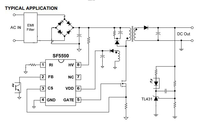 SF5590是一款高性能,高效率,高集成的電流模式PWM控制器,適用于大中型離線反激式轉(zhuǎn)換器應(yīng)用。PWM開關(guān)頻率與洗牌固定為65KHz的,并修剪成窄幅波動(dòng)。當(dāng)輸出功率要求降低,IC自動(dòng)基于專有η - BalanceTM控制,以提高電源轉(zhuǎn)換效率在輕負(fù)載減小開關(guān)頻率。 SF5590還集成了專有的HV- MWTM技術(shù),實(shí)現(xiàn)小于50mW的待機(jī)功耗。