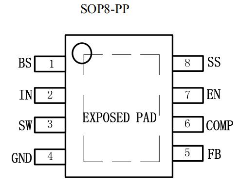 | 1 | BS | 上管柵極驅動升壓輸入。BS為上管N溝道MOSFET開關提供驅動。從SW到BS端連接一個0.01uF或更大的電容。 |