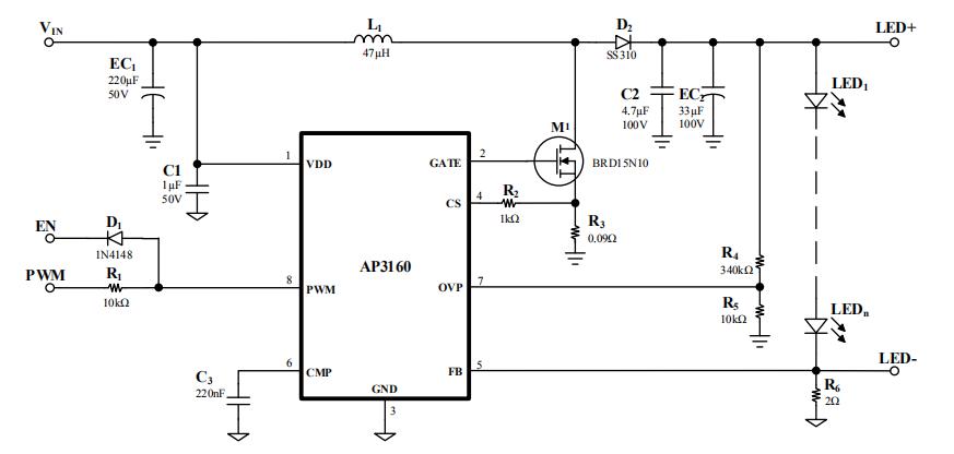 AP3160升壓型led背光驅動芯片提供 LED 開環保護,LED 的陰極對地短路保護, 二極管短路和電感短路保護。其它特性包括限流保護, 過溫保護, 欠壓鎖定和過壓保護。