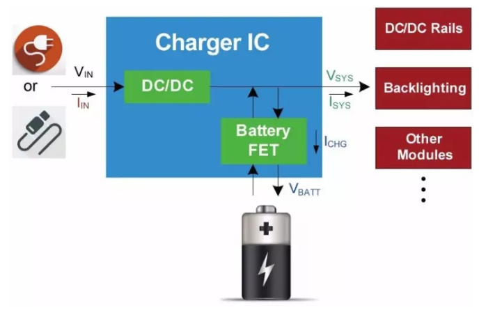充電IC是基于電池和系統負載之間的連接方式的不同,系統負載可以由輸入電源供電,也可以由電池供電,或者由兩者同時供電。那么電池IC就必須具備功率管理功能,來實現系統負載功率來源的選擇。