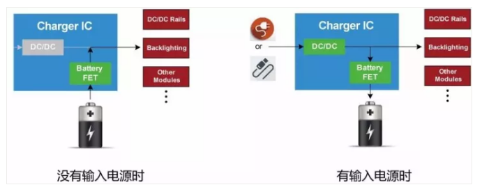 當輸入電源沒有接入時,Battery FET被完全打開,電池直接給系統負載供電。當有輸入電源時,系統母線的電壓由DC/DC調節,同時系統母線通過Battery FET給電池充電。但是系統負載具有更高的用電優先級。充電IC會根據輸入電源的能力和系統負載的需求優先給系統供電,剩余的功率用來給電池充電。
