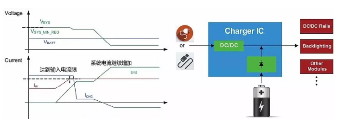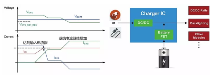 在以上的充電過程中,當總的系統負載需求超過輸入電源的能力時,系統母線電壓會下跌,充電IC就會減少充電電流以保證總的負載功率不再繼續增加,從而穩定系統電壓不再下跌,維持系統負載的平穩運行。