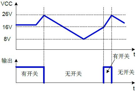 當VCC 電壓超過過壓保護點26V 時,觸發VCC 過壓保護,此時功率MOSFET 關斷,系統將自動重啟。
