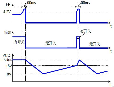 當輸出發生過載時, FB 電壓會升高,當升到FB 過載保護點4.2V 時,且再經過過載保護延時90ms 后,功率MOSFET關斷,VCC 電壓開始下降;當VCC 電壓降到關斷電壓8V 時,電路重新啟動。