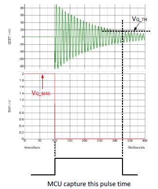 HC5808L soc單芯片集成了精確的Q因子檢測電路實現異物檢測之前WPC v1.2.4中的選擇階段。當q_det_bias_en位設置為“1”時,sw1將被強制為偏置電壓和SW2將連接到GND在內部,所以LC槽中的電容器將被充電到偏壓。當q_det_bias_en位設置為“0”時,SW1將突然被強制接地。然后預充電電容器中的偏壓將在LC中回響坦克。QDET引腳可用于檢測振鈴電壓帶有外部電阻分壓器。HC5808L單芯片soc內部的比較器將QDET電壓與閾值進行比較并輸出內部邏輯高信號通知單片機當達到閾值時。單片機可以計算時間從q_det_bias_en bit設置到比較器的“0”開始輸出高中斷。如果有任何異物放在發射線圈,這個時間會短得多。