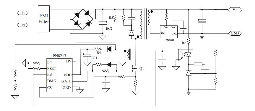 在電路保護方面,PN8213芯片具有逐周期過流保護、輸入欠壓保護、輸出過壓保護、輸出開/短路保護、DMG電阻短路保護、次級整流管短路保護、過負載保護、雙重過溫保護等,提供全面的保護,以防止電路在不正常情況下受到損壞,此外,還具有頻率調制和智能驅動功能可使噪聲最小化,從而改善EMI的性能。