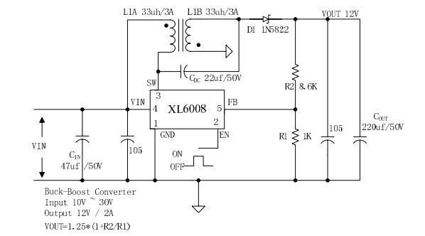 如果要求輸出電流在3A以內,那么可以用xl6008,這款寬輸入范圍,電流模式,能夠產生或正或負的輸出電壓的DC / DC轉換器,它的輸入電壓范圍是5V~32V,輸出電壓調節范圍是60V。12V輸出的實用電路如圖1.