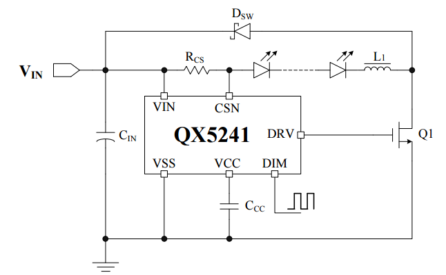 QX5241是通過外接一個(gè)電阻設(shè)定輸出電流,最大可達(dá)3A,通過DIM引腳實(shí)現(xiàn)輝度控制功能。并采用泉芯特有的專利結(jié)構(gòu),在寬輸入電壓范圍下,保證電流檢測達(dá)到±5%的電流精度,由于采用滯環(huán)控制方式,QX5241對負(fù)載瞬變具有非常快的響應(yīng)速度,對輸入電壓具有高的抑制比,最高工作頻率可到2MHz,工作溫度范圍從-40℃到125℃.