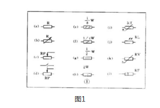 符號詳見圖1所示,其中(a)表示一般的阻值固定的電阻器,(b)表示半可調(diào)或微調(diào)電阻器;(c)表示電位器;(d)表示帶開關的電位器。電阻器的文字符號是“R”,電位器是“RP”,即在R的后面再加一個說明它有調(diào)節(jié)功能的字符“P”。在某些電路中,對電阻器的功率有一定要求,可分別用圖1中(e)、(f)、(g)、(h)所示符號來表示。還有幾種特殊電阻器的符號,第1種是熱敏電阻符號,熱敏電阻器的電阻值是隨外界溫度而變化的。有的是負溫度系數(shù)的,用NTC來表示;有的是正溫度系數(shù)的,用PTC來表示。它的符號見圖(i),用θ或t°來表示溫度。它的文字符號是“RT”。第2種是光敏電阻器符號,見圖1(j),有兩個斜向的箭頭表示光線。它的文字符號是“RL”。第3種是壓敏電阻器的符號。壓敏電阻阻值是隨電阻器兩端所加的電壓而變化的。
